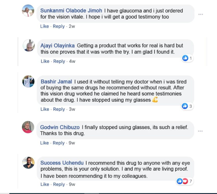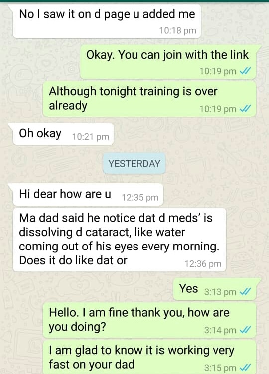 “My Father of 53 years old is currently using this product and it has been a wonderful experience seeing my father walk around the house without using a walking stick or someone holding her so as to show him the way. He could barely see before he started using this product. Now his eye sight is as bright as an eagle. No more constant drugs that does not actually work or constant use of eye drops”.